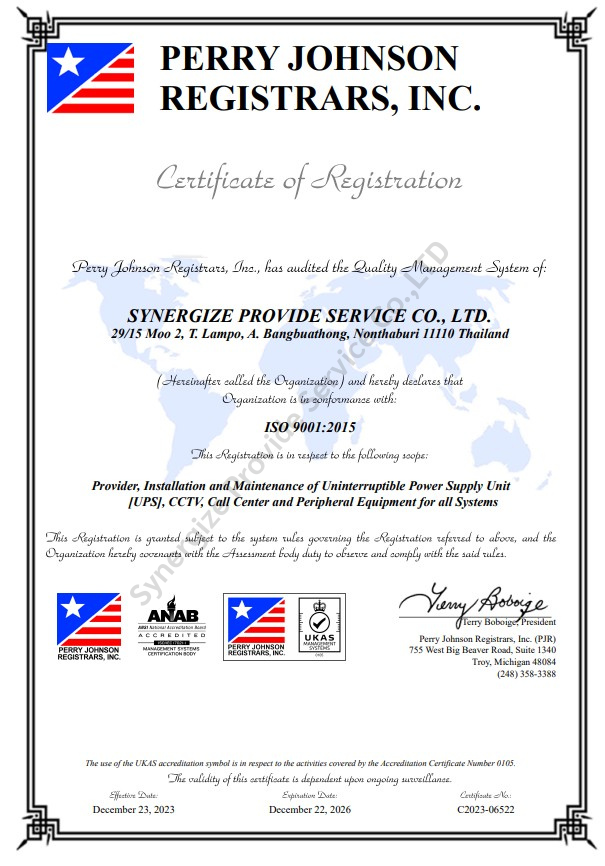 With potential and determination to improve service as well as continuous organizational management systems, resulting in Synergize Provide Service Co., Ltd. has been certified Quality control ISO 9001 : 2015 covering : Provider, Installation and Maintenance of Uninterruptible Power Supply Unit (UPS), CCTV, Call Center and peripheral Equipment for all systems.